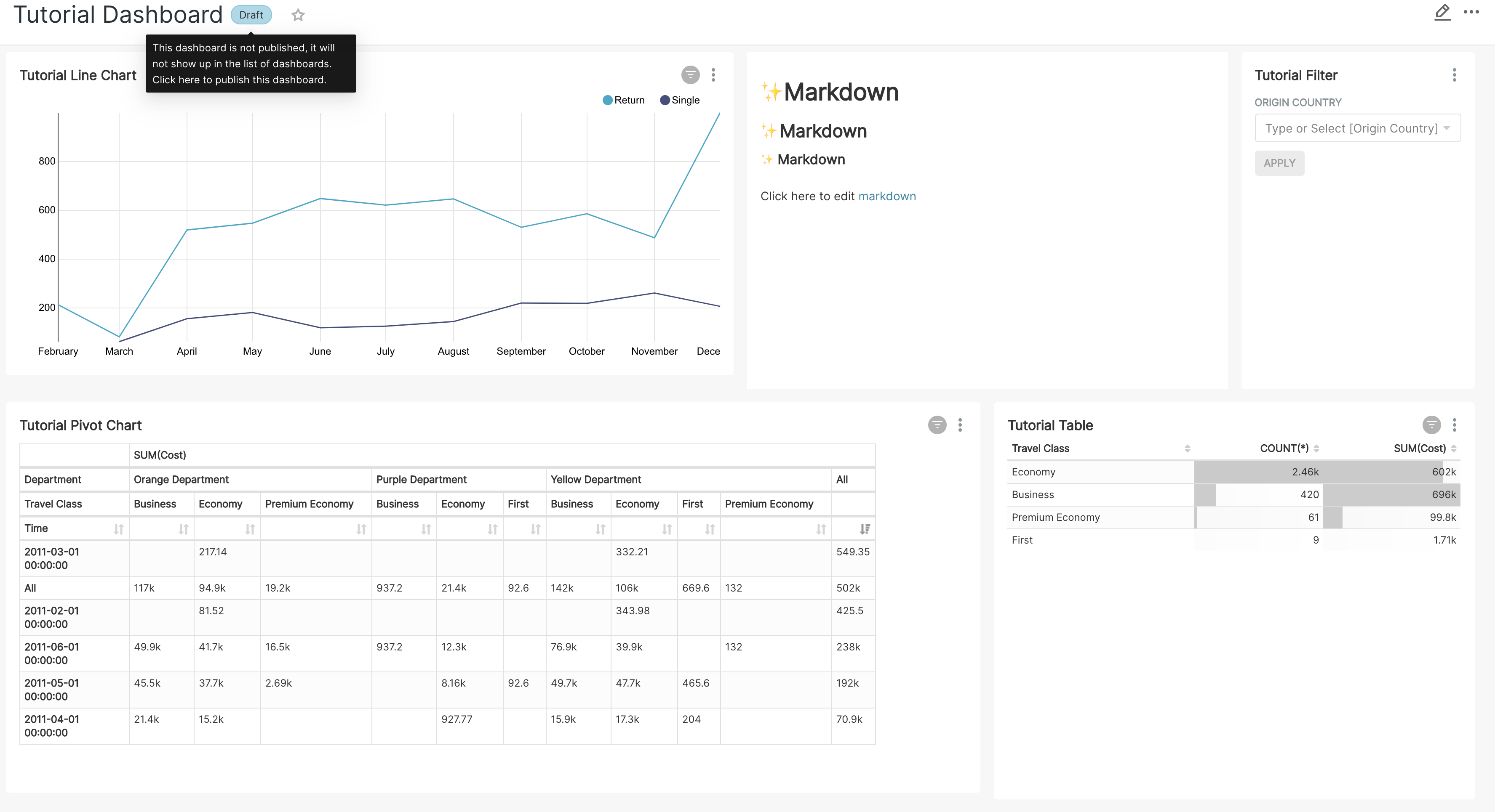 You should see months in the rows and Department and Travel Class in the columns. Publish this chart to your existing Tutorial Dashboard you created earlier.